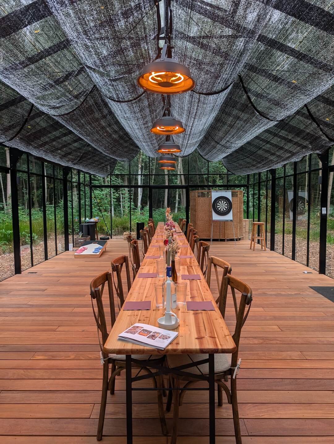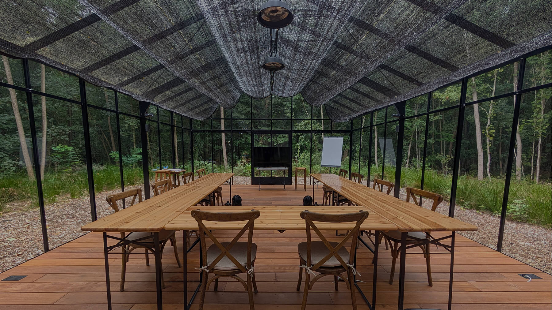 Le prix de la retraite inclut tous les enseignements de yoga prévus dans le planning de la retraite, les repas quotidiens, du dîner à votre arrivée au brunch le jour du départ. Le linge de lit et les serviettes de bain sont également fournis. Tous les espaces communs sont accessibles pendant la retraite (verrière pour pratiquer, espace sauna et bain glacé, salon et salle à manger, domaine forestier). La verrière dispose des essentiels pour le yoga (tapis, bolster, briques, sangle). Le salon propose aussi quelques jeux de société, livres et bandes dessinées.